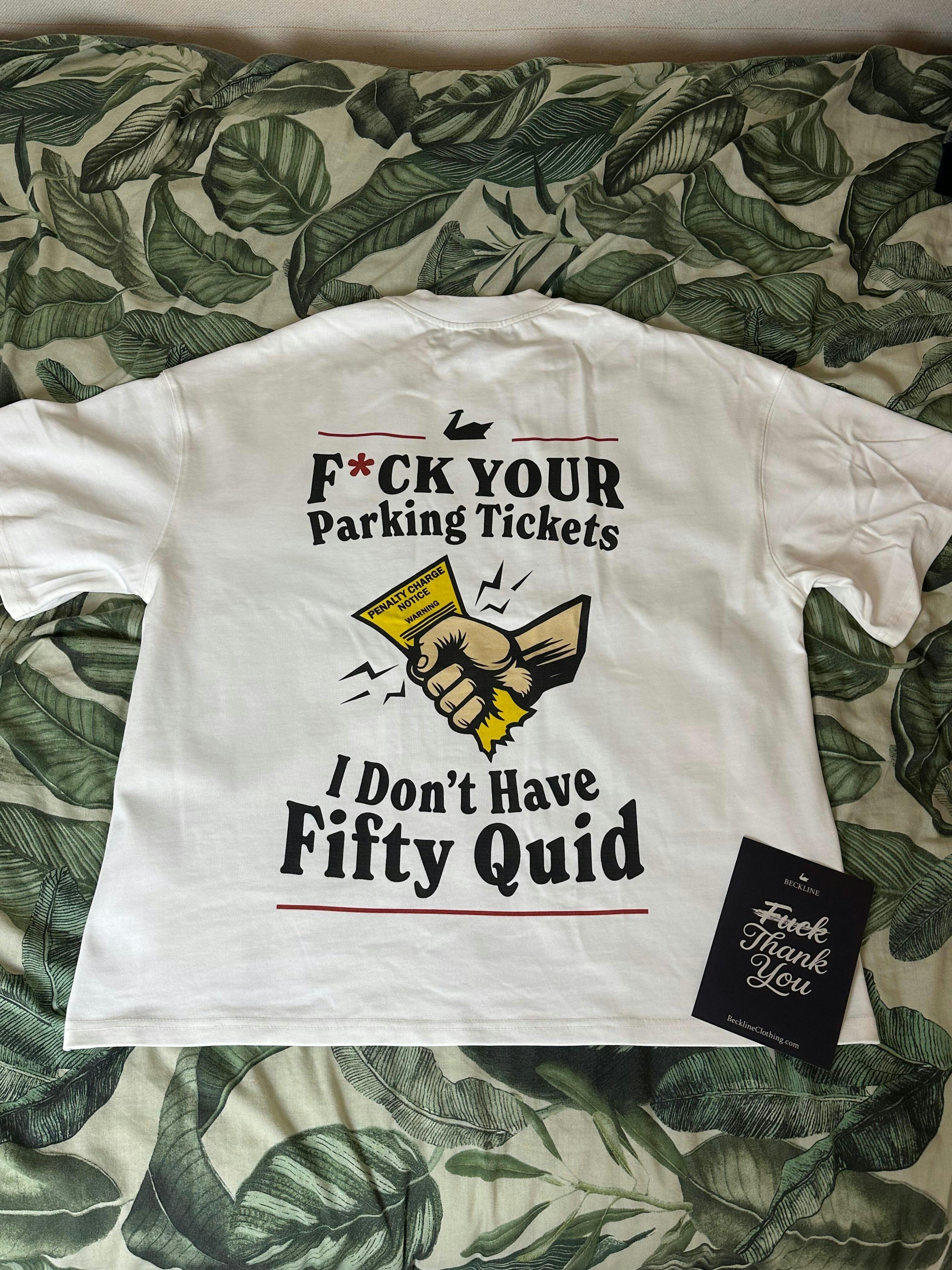 The Parking Ticket shirt is an oversized, 100GSM cotton blend tee that features a large printed graphic on the back and a small chest logo on the front.